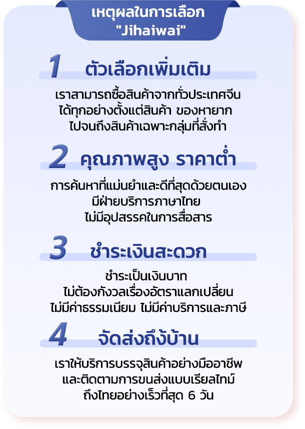 ข้อกำหนดและรายละเอียดต่างๆสงวนสิทธิไว้กับ “Jihaiwai” เท่านั้น โดยอยู่ภายใต้ขอบเขตที่กฎหมายกำหนด